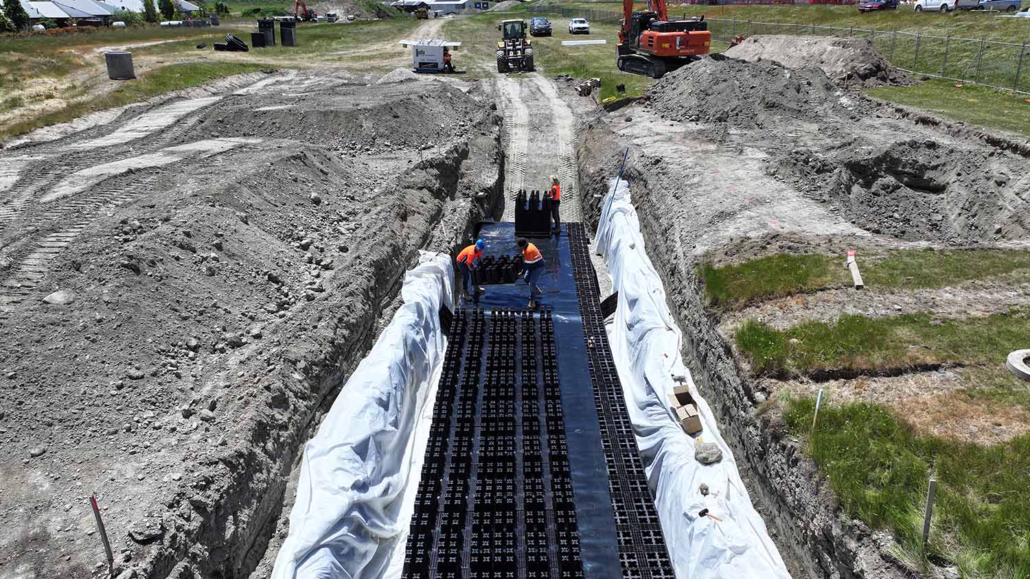 Cirtex worked closely with the project engineer and QLDC to upgrade the designs and get the product approved. Originally designed as a 144m3 traditional plate system, the upgrade to AquaFort offered several benefits. AquaFort modules provide 40 tons/sqm of compressive strength versus the traditional plate system, which has a compressive strength of 27 tons/sqm. This provides increased resilience in design and gives more exibility around system inverts due to the reduced cover material requirements.