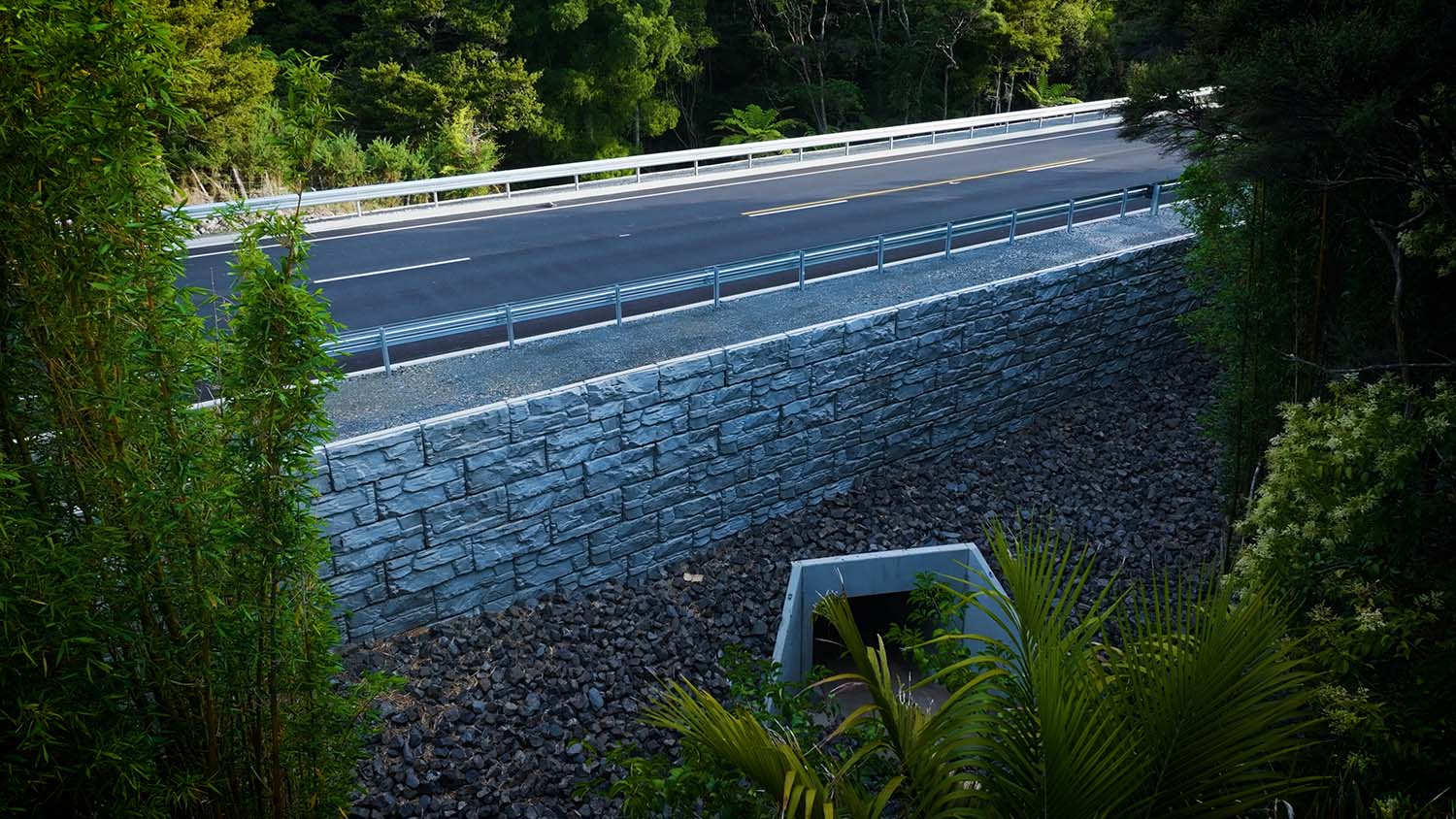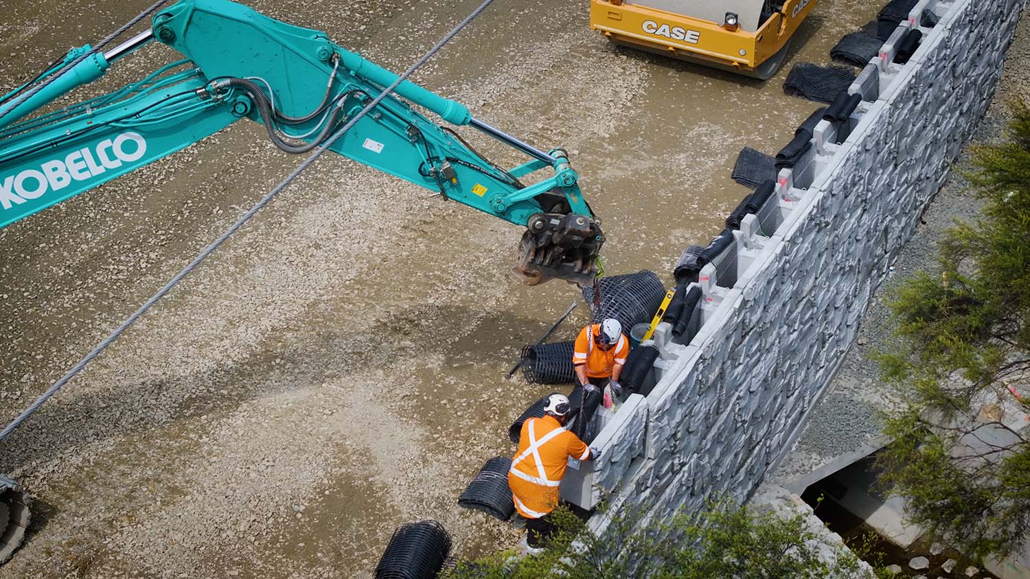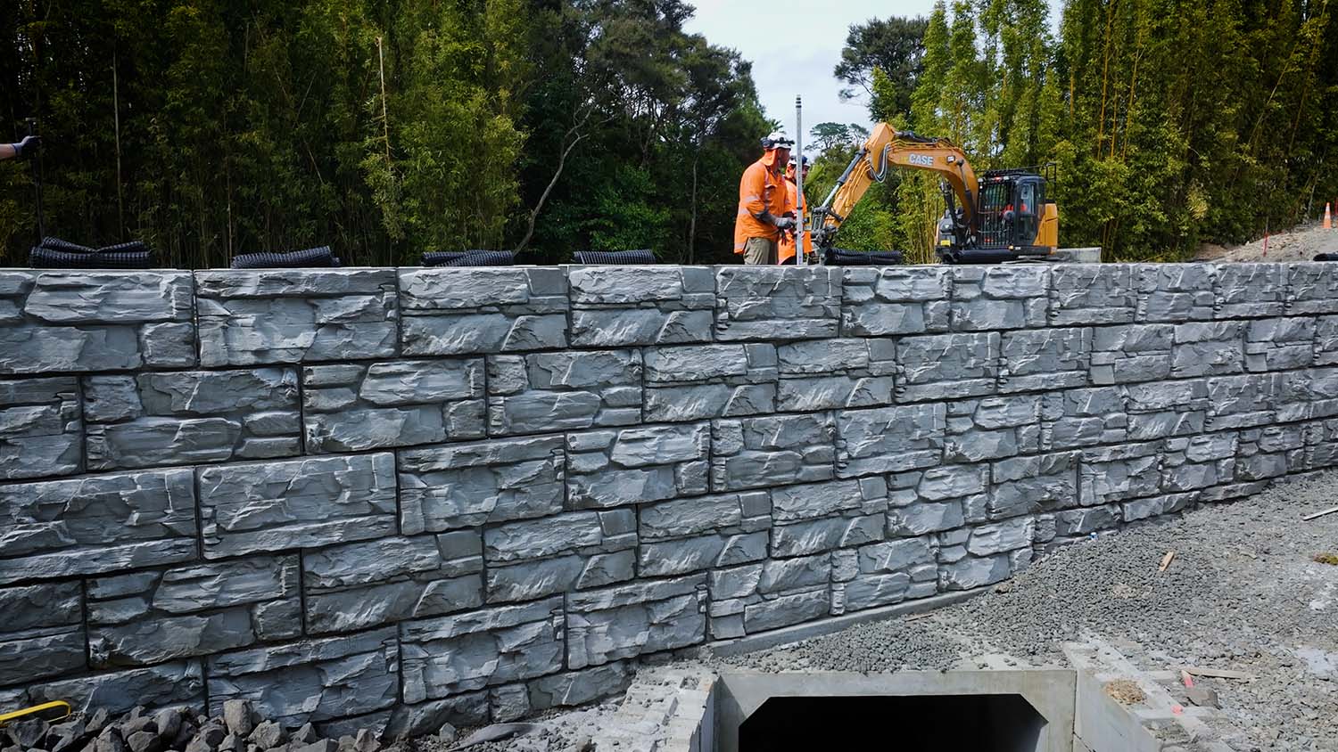 After removing the failed materials and old culvert, Downer constructed the new walls around the replacement culvert. Despite limited access and a compressed timeline, Cirtex rapidly scaled production and delivery to maintain a steady supply of custom MagnumStone units, keeping the project on schedule.