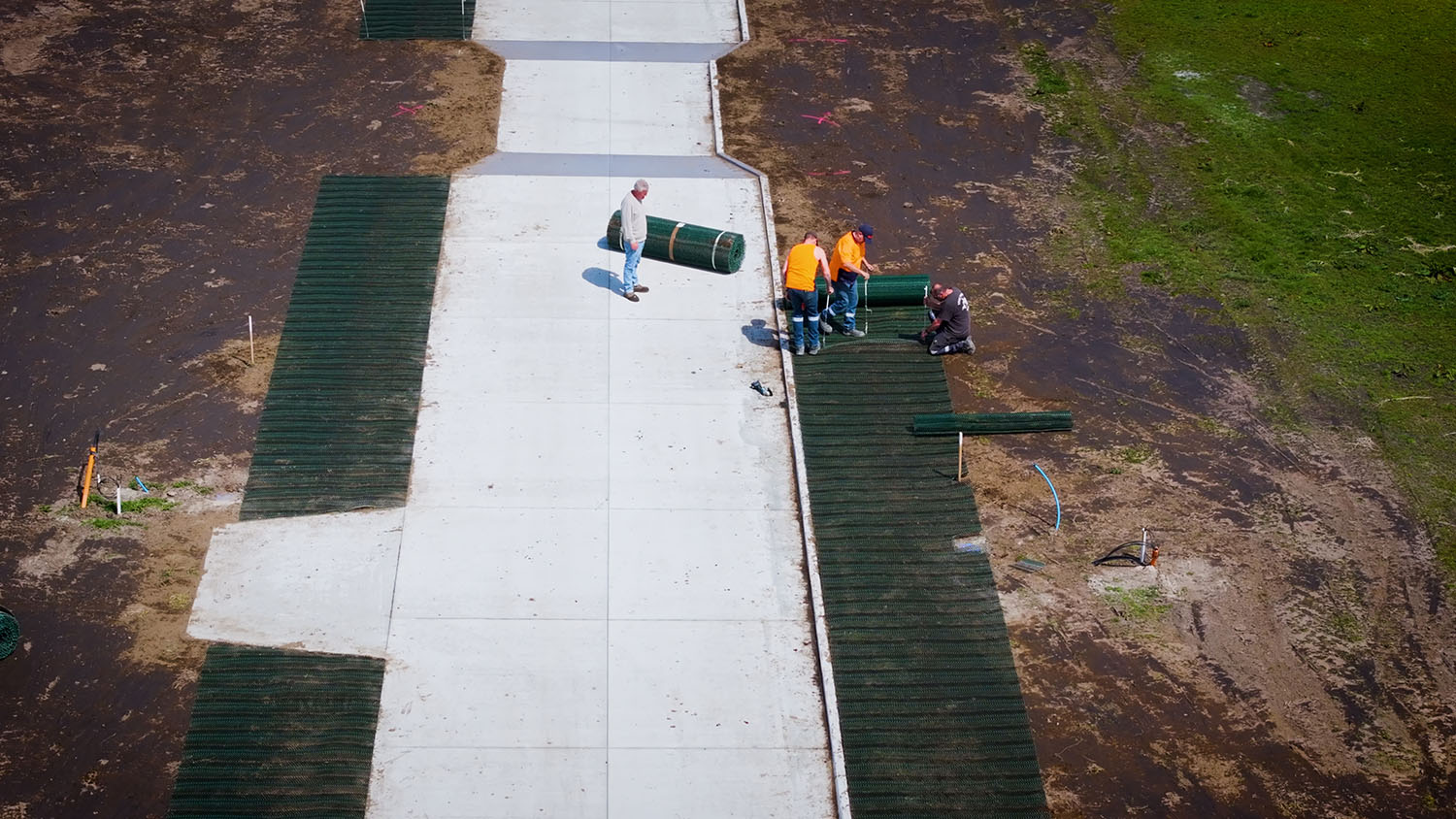 For an existing grassed surface (which will be most cases), simply mow the existing grass short and roll the SureFlex out over the area to be reinforced. Then pin it to the surface using the ground pins that come with each roll.